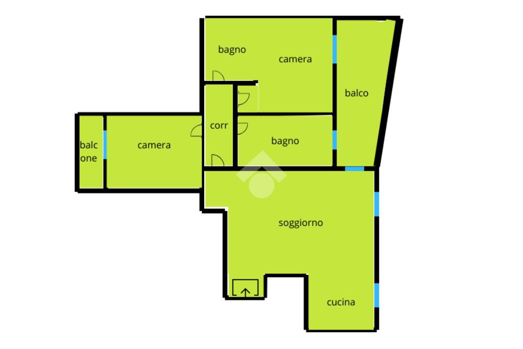 L’ingresso dell’appartamento è sul soggiorno open space con angolo cucina, molto luminoso e con accesso sul balcone esposto ad est; dal disimpegno raggiungiamo le due camere da letto, una matrimoniale con balconcino e una cameretta, grande bagno finestrato con box doccia ed un secondo bagno cieco con doccia.