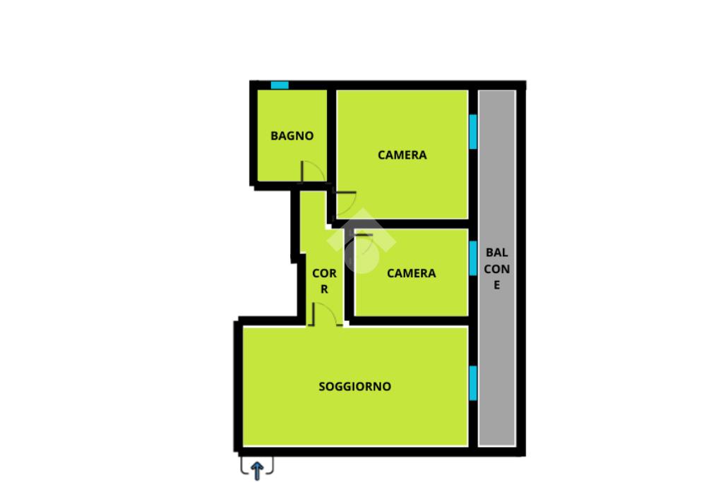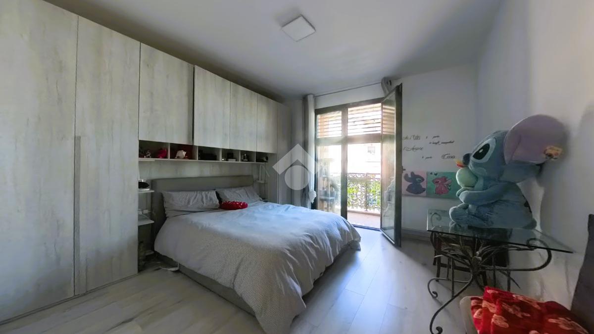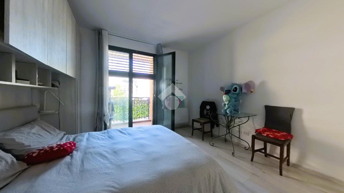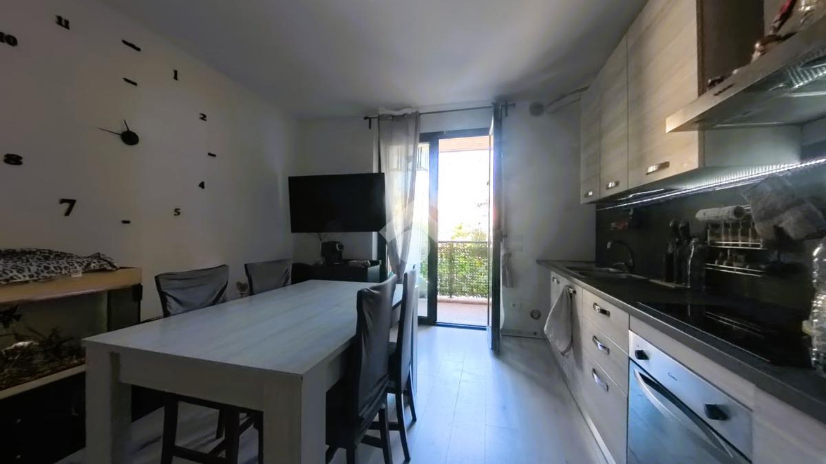 L’ingresso dell’appartamento è sul soggiorno open space con angolo cucina, molto luminoso e con accesso sul balcone; dal disimpegno raggiungiamo le due camere da letto, una matrimoniale con balcone e una cameretta, bagno finestrato con box doccia, al piano S1 garage di 20 mq.