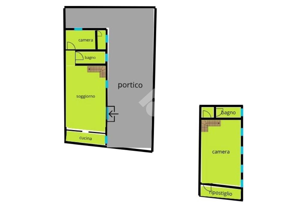 La villetta con portico antistante di 100mq circa, ha l'ingresso sul grande soggiorno con camino che domina il piano terra; soffitto alto , travi a vista e pavimento simil cotto rendono l'ambiente estremamente caldo; completano il piano: un cucinotto finestrato con dispensa, il bagno principale finestrato con box-doccia ed una cameretta con piccolo locale lavanderia. Attraverso la scala interna si raggiunge il primo piano, dove attualmente troviamo un'unica stanza da letto di 40 mq con 4 finestre ampie; tale distribuzione consente di poter suddividere in più stanze il piano; completano la proprietà un secondo bagno ed un ripostiglio.