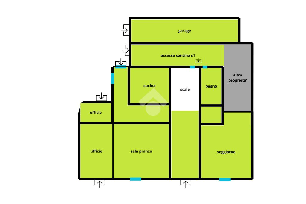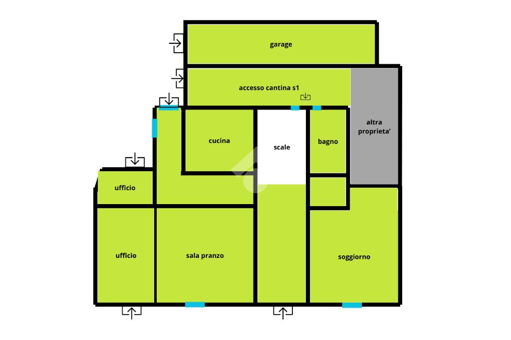 Diverse sono le pertinenze legate alla casa: sulla corte pavimentata all'ingresso è presente un ufficio indipendente di circa 15 mq; con accesso da strada secondaria, il garage al piano terra di 30 mq e un locale cantina di 30 mq al piano S1.